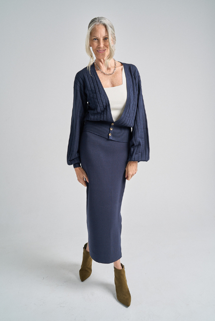 "We love Birdie & Claire’s Elise Sweater, which is made from a blend of plant-based EcoViscose and stretch polyester, which is the perfect weight."