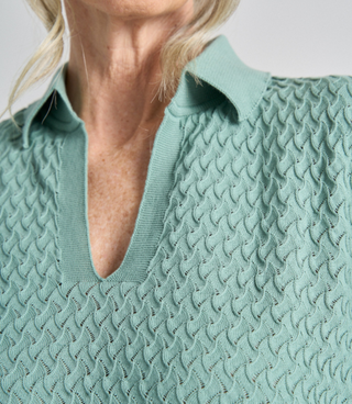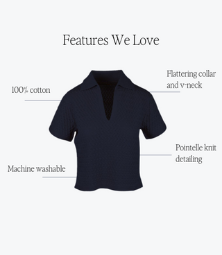 Discover the charm and sophistication of the Sylvie top. 100% cotton, featuring intricate pointelle detailing that sets it apart from the ordinary. With its sleek neckline and elegant knit, this collared polo transcends the basics and becomes a truly stylish statement piece.